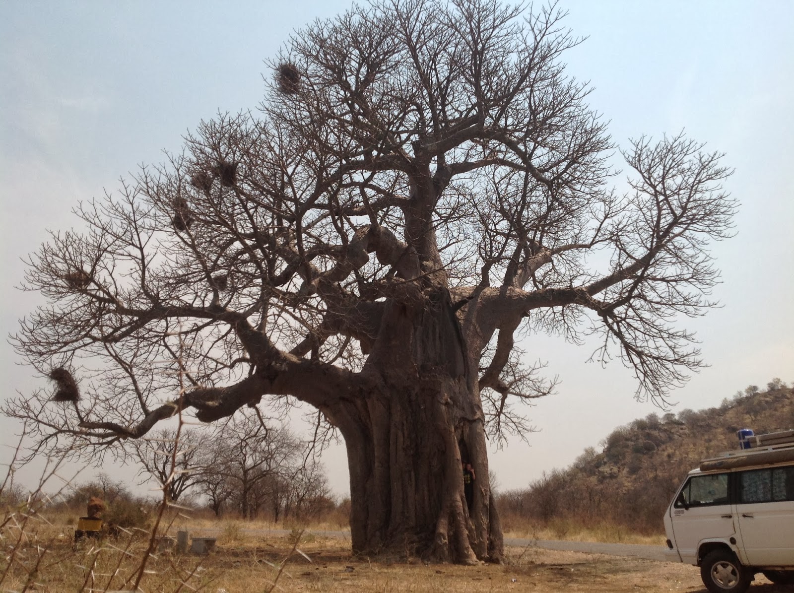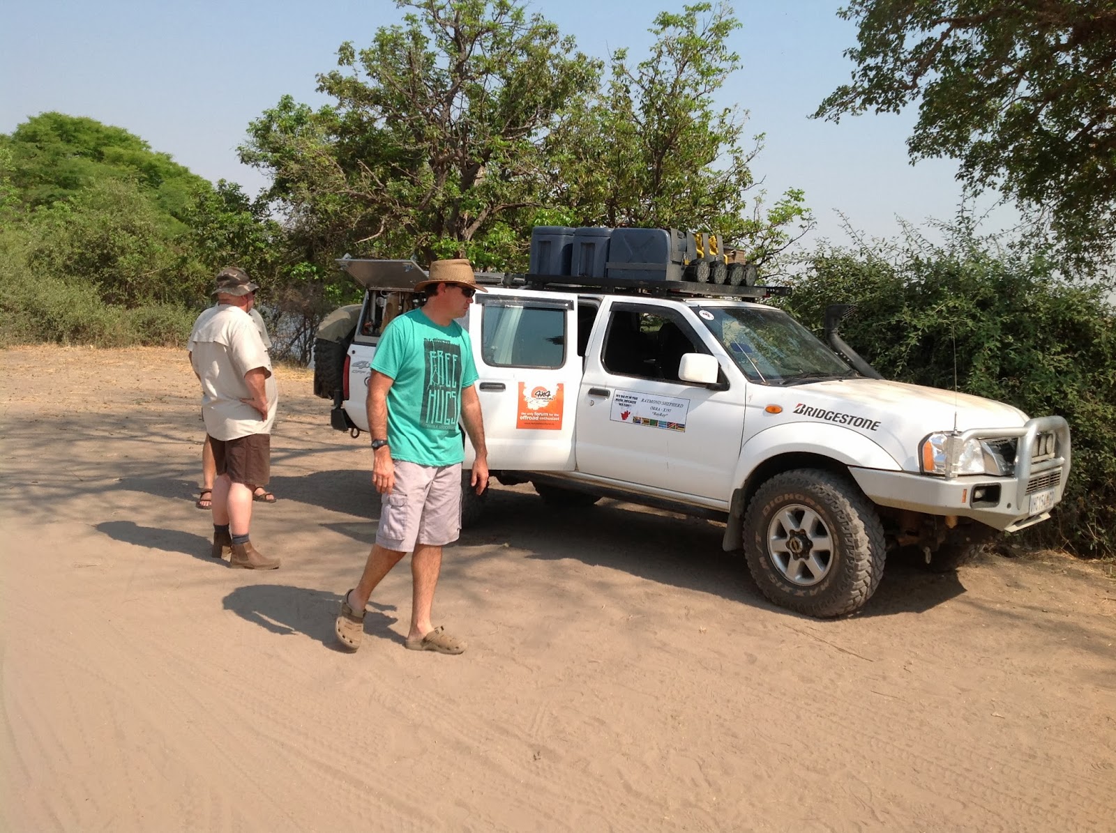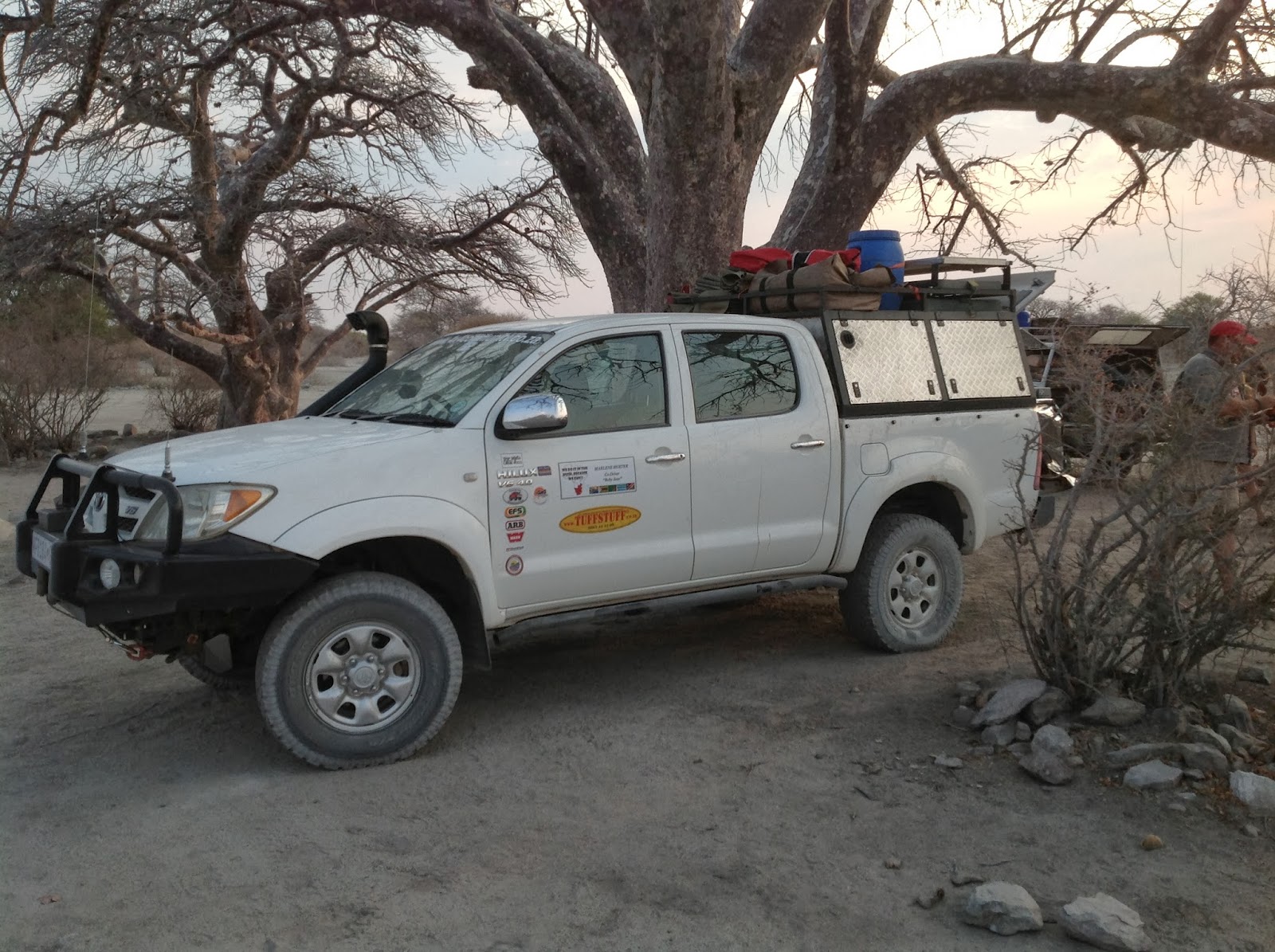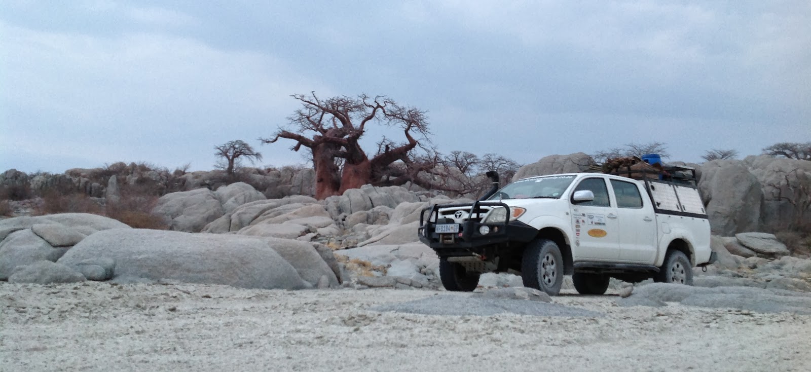 We stopped at this beautiful old Baobab just before Selibi Pikwe to take some pics. Everybody had a chance to park his vehicle next to the tree. On my way back I saw some fluid dripping from the engine of Malans vehicle. At first we thought it to be a gasket leak and luckily for him I saw it before the vehicle overheated. After filling it up and everybody taking pictures we proceed to Selebi Pikwe and we stopped every 30km or so to top up the water of his truck preventing it from overheating.
