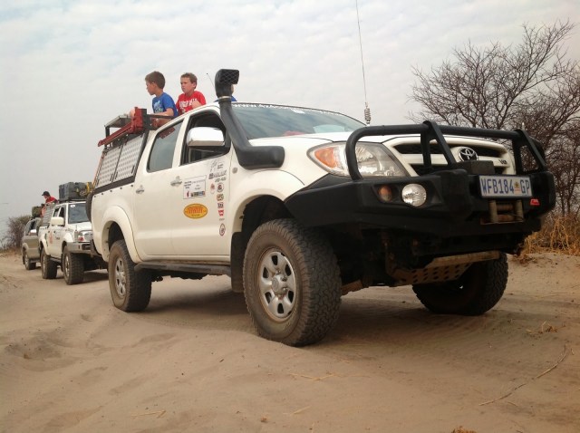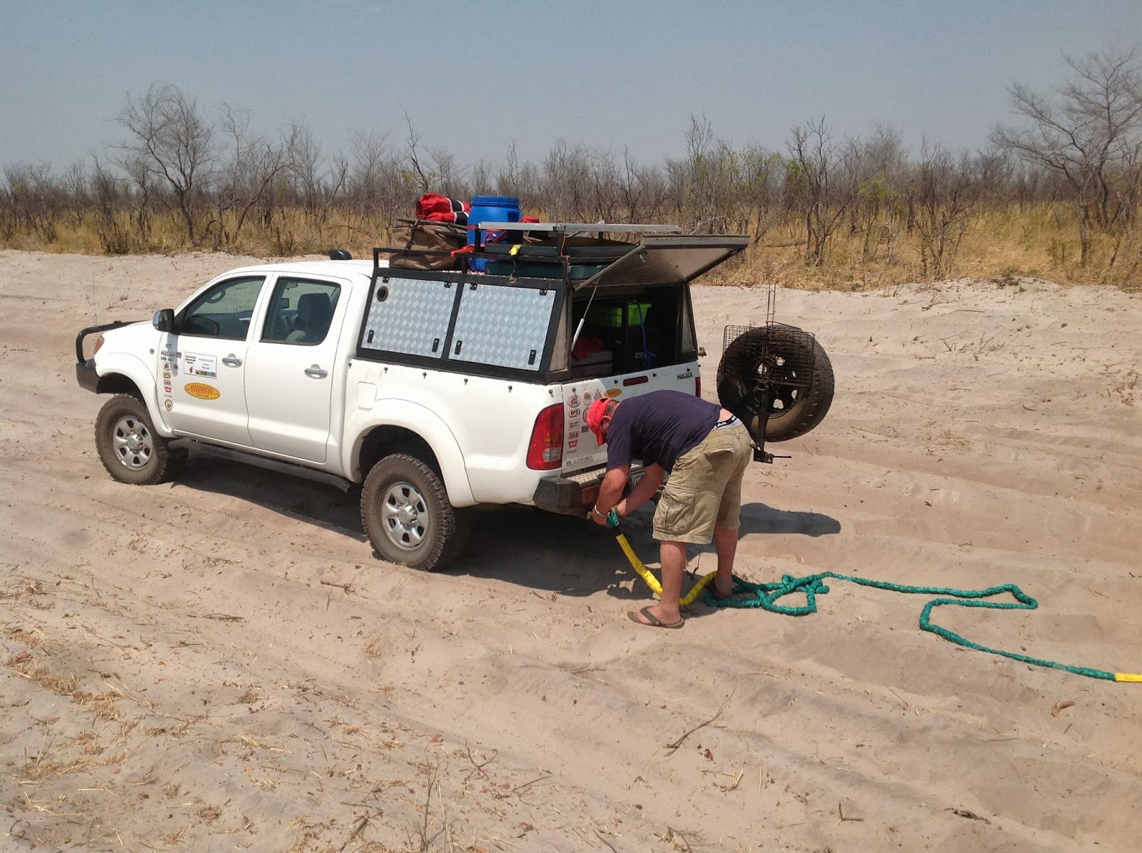 Just another Toyota team effort to safe a stranded Landy. After winching it out the cruiser of oom Piet hooked the caravan and towed it the last bit to Senyati.