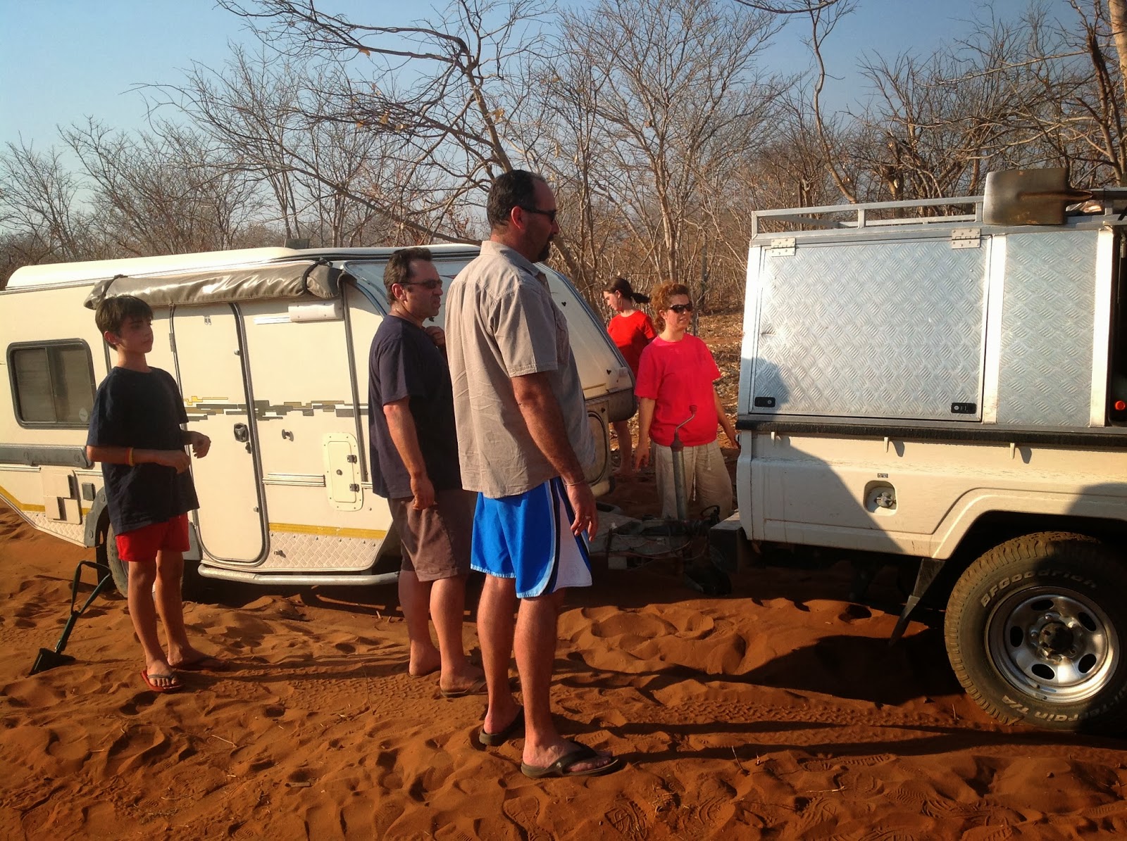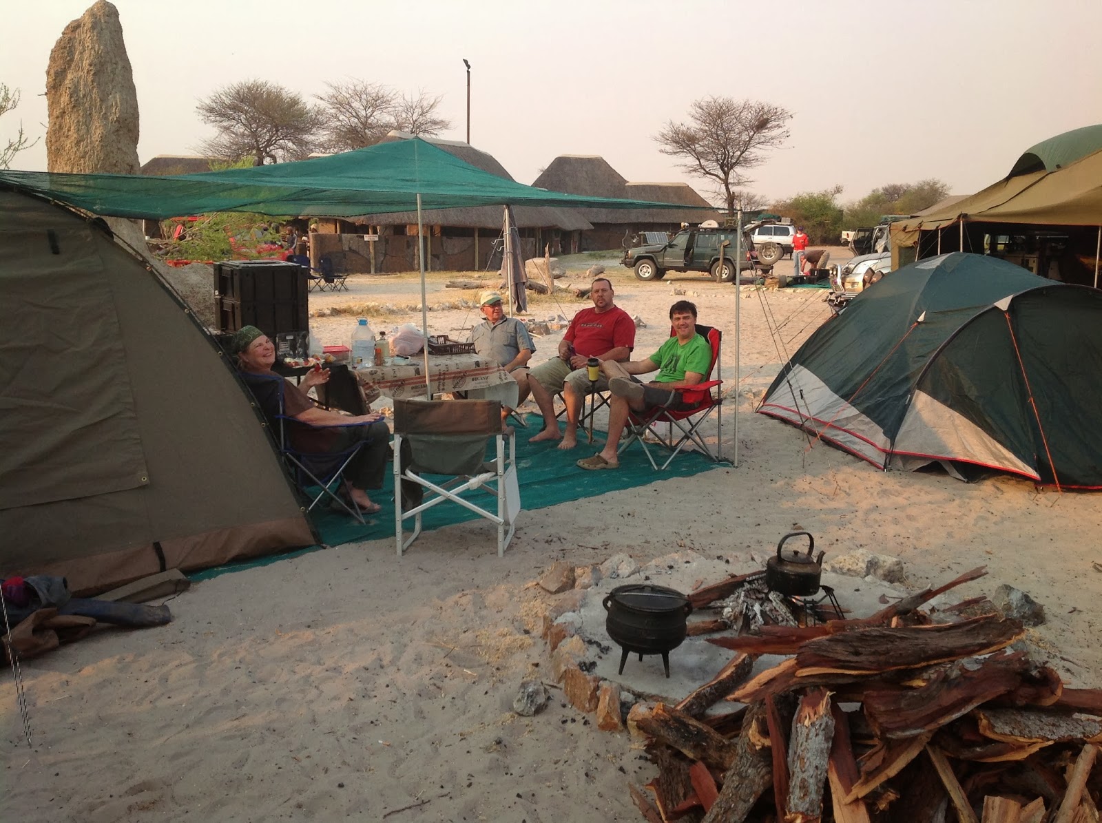 Oom Piet, Mary-Ann, Bulletjie (green shirt) and me (red shirt) chatting at our tent with Sven next door.