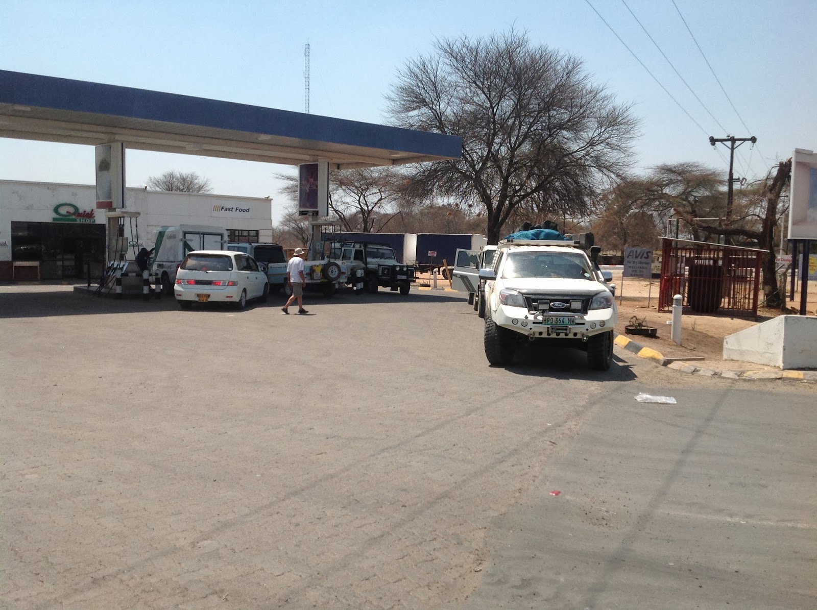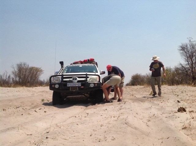 In Selebi Pikwe we filled all the tanks and Jerry cans with the cheaper Botswana fuel. We also tried some stop leak in the radiator for Malans vehicle which were unsuccessful. In the picture above we were doing the last water top up before Francistown where Malan would stay behind to have the leak fixed the next day. We encountered another problem when Bernard’s Combi did not want to start. After everything was tried with no success he was towed the last part to Francistown.
