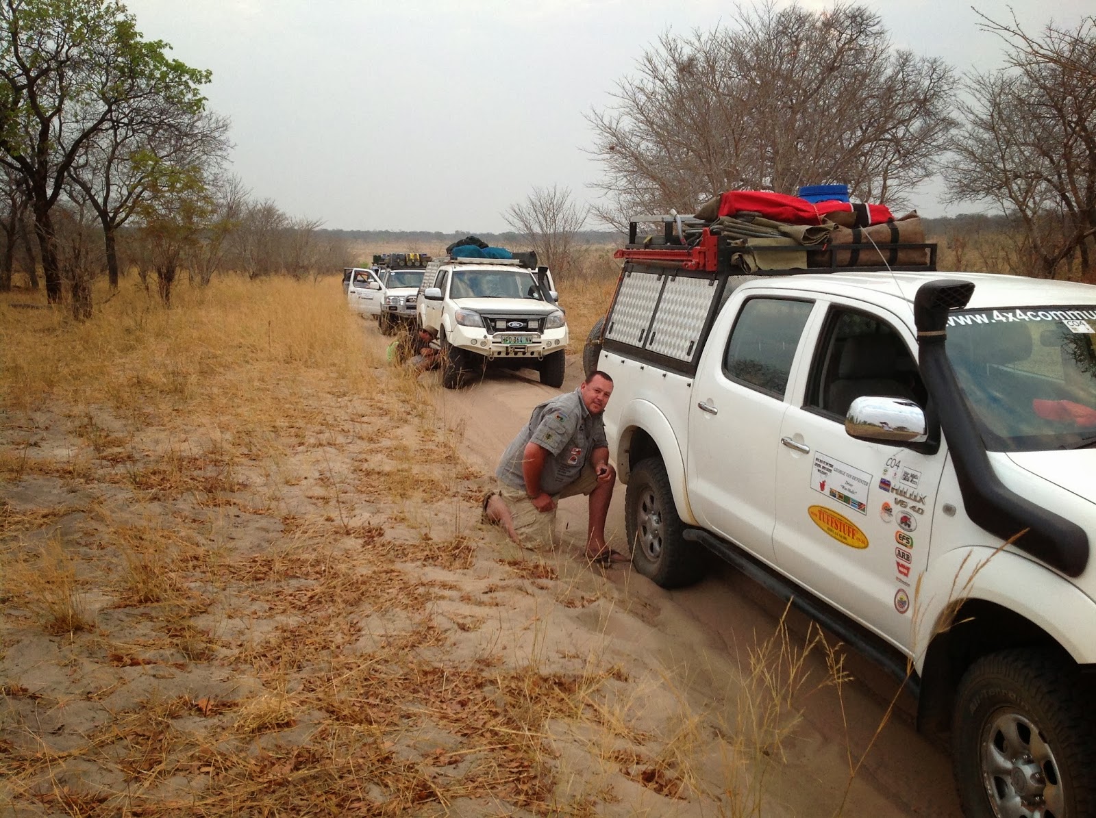 We left Senyati about 5:30 to be at Sedudu gate entering Chobe National park at 6:00. The road we were taking was unknown to all of us and all we knew about it was that it had patches of thick sand and not even the rangers at Sedudu could tell us anything about it. The looks we got from them after asking about the road were that “are you crazy” kinda look. All we knew was that we had to leave Chobe at Poha. All our trust in Tracks 4 Africa we soldiered on. Not long after leaving the tar road the sand started and we all stopped to let out some air in the tires.